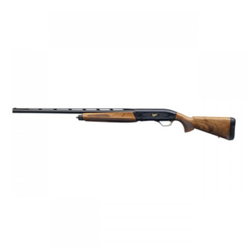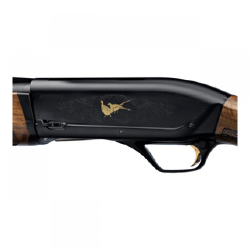 Das schwarze Aluminium-Systemgehäuse reduziert das Gewicht und unterstützt ein angenehmes Handling. Besonderer Blickfang sind die Wild- und Arabeskengravuren mit goldfarbenen Enten und Fasanen, die sich kontrastreich vom dunklen Untergrund abheben. Der 762 mm lange Back-bored-Lauf mit 6 mm ventilierter Laufschiene sorgt für gleichmäßige Schrotverteilung und ein ruhiges Schwungverhalten. Das Fiberoptik-Korn ermöglicht eine schnelle, klare Zielaufnahme auch bei schwierigen Lichtverhältnissen.
