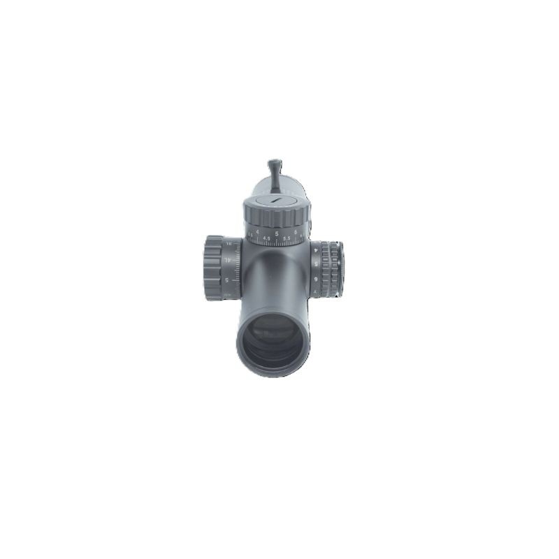 Über 90 % Lichttransmission liefern ein helles, klares Bild mit hoher Detailtreue. Die hydrophobe Linsenbeschichtung unterstützt eine klare Sicht auch bei widrigen Wetterbedingungen. Das beleuchtete Mil-Dot-Absehen (rot) in der ersten Bildebene (BE 1) erlaubt präzise Haltepunkte über den gesamten Vergrößerungsbereich hinweg. Die Beleuchtung wird über einen Drehknopf mit 12 Stufen gesteuert und mit einer CR2032-Batterie betrieben.