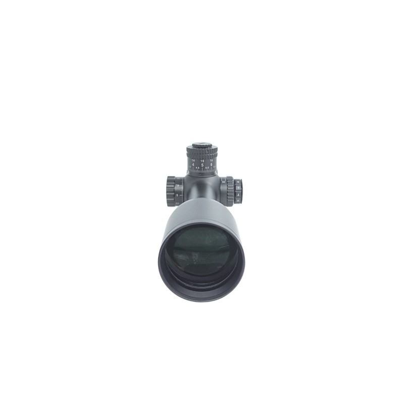 Das beleuchtete Mil-Dot-Absehen in der ersten Bildebene (BE 1) ermöglicht exakte Haltepunkte und zuverlässige Entfernungsabschätzung über den gesamten Zoombereich. Die Beleuchtung wird über einen Drehknopf mit 12 Stufen geregelt und von einer CR2032-Batterie betrieben.