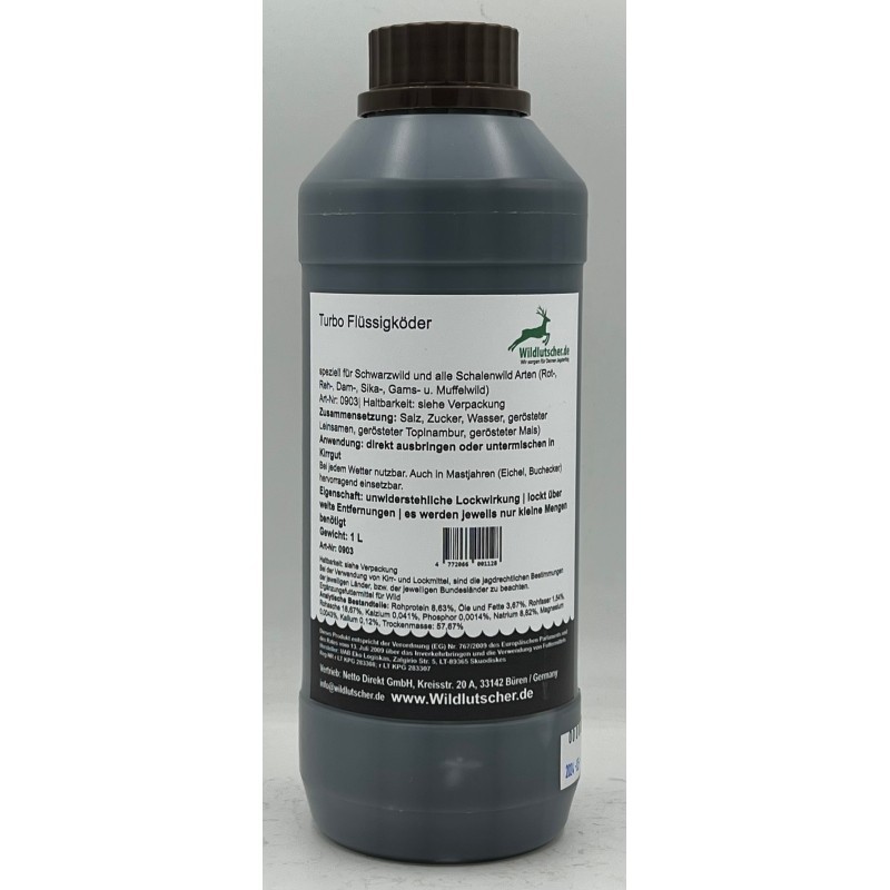 Der Wildlutscher Turbo Flüssigköder ist ein extrem effektives Lockmittel, das speziell entwickelt wurde, um alle Wildtierarten zuverlässig anzulocken. Durch seine intensive Duftwirkung zieht es Wild über weite Distanzen an und sorgt für eine magnetisierende Anziehungskraft.